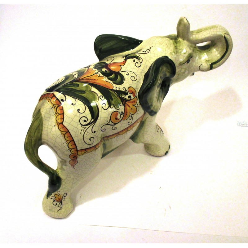 Elefante in ceramica artistica decorato a mano, dimensioni cm 43 x 30, lo smalto presenta la finitura satinata e cavillata.
