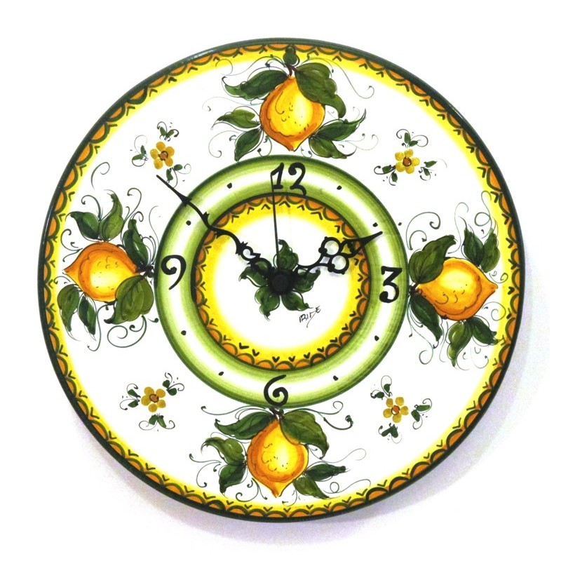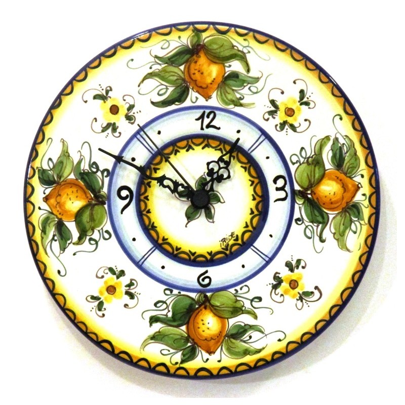 Orologio rotondo in ceramica artistica dipinto a mano con decoro sui toni del giallo e del verde o del blu.
