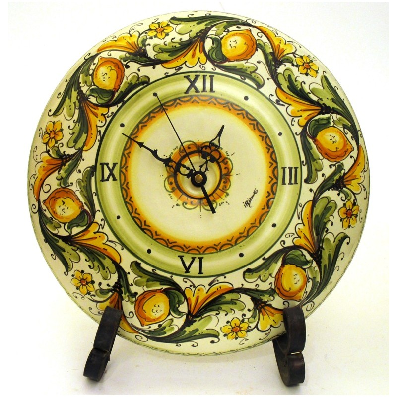 Orologio rotondo bombato in ceramica artistica dipinto a mano con decoro ornato di limoni sui toni dell' giallo arancio e del verde. Il suo diametro è di 29,5 cm