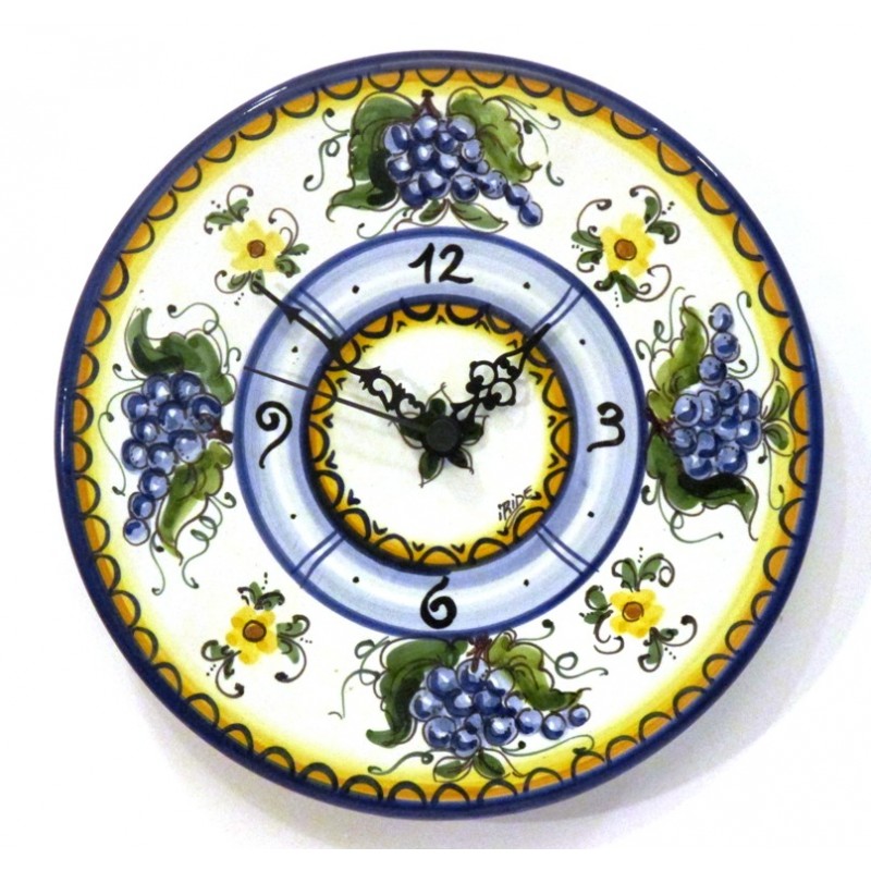 Orologio rotondo  in ceramica artistica dipinto a mano con decoro sui toni del giallo e del verde o del blu.