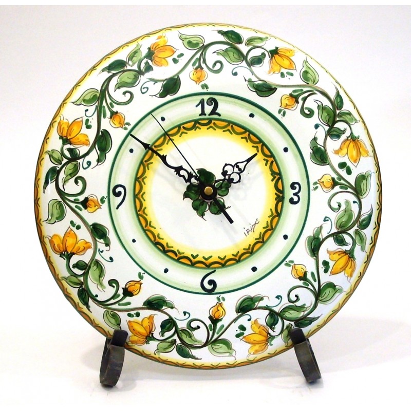 Orologio rotondo in ceramica artistica dipinto a mano con decoro sui toni del giallo e del verde o del blu.