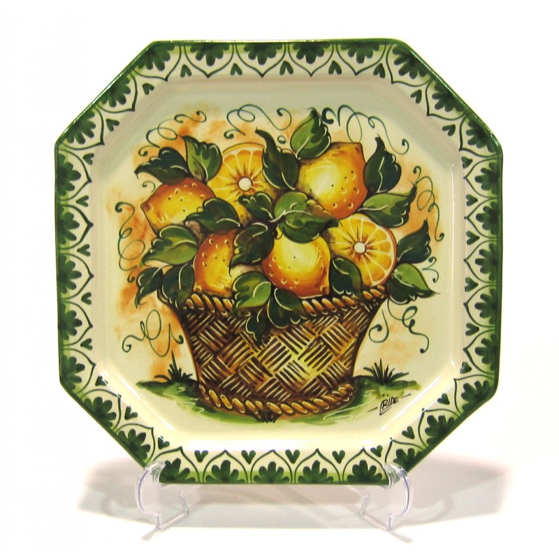 Piatto da muro ottagonale dipinto a mano, decoro Cestino Limoni, disponibile in vari colori e misure